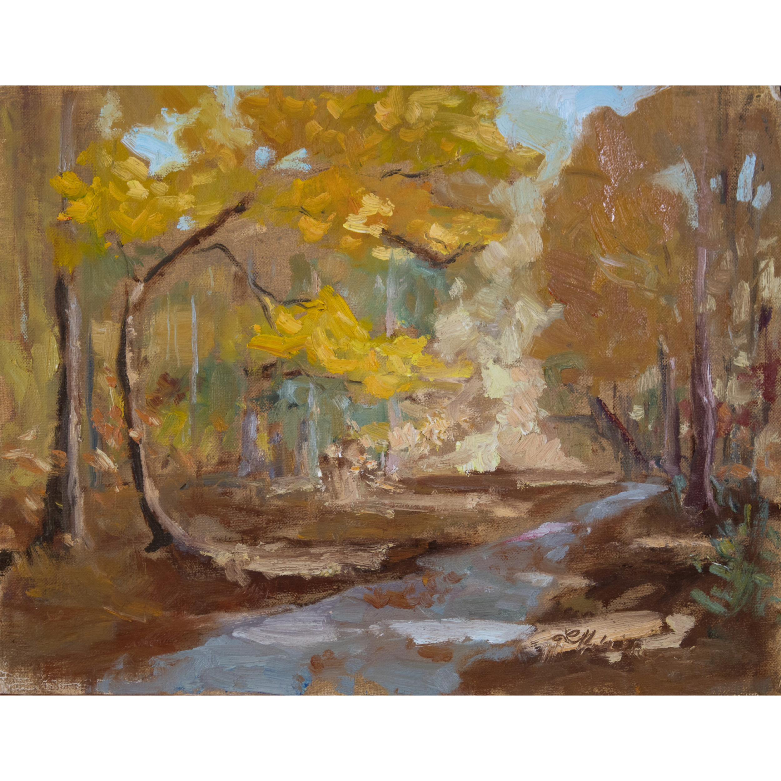 This plein air sketch captures the mottled golden light filtering through the autumn trees on the gravel drive leading back to the lake.